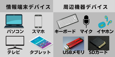 デバイスは大きく分けると「情報端末」と「周辺機器」の2つに分かれます。